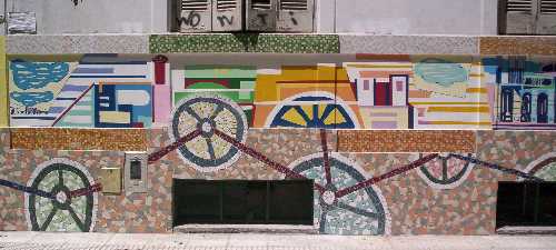 - Por favor, contame de qué se trata la obra que estás haciendo en el pasaje Discépolo. - La CADMIRA, que es la Cámara de Comerciantes de Once, me eligió para que haga un trabajo sobre las paredes de la parte de atrás de la Escuela 9, la Sarmiento, eso está sobre lo que antiguamente era el pasaje Rauch, que va desde Callao y Lavalle hasta Corrientes y Riobamba, ahí tomé como lo vengo haciendo últimamente y con mucha más razón en este caso, una partitura de tango textual, en esta oportunidad "Uno" de Discépolo y Mariano Mores, o sea que aspiro a que a la fecha de inauguración del trabajo que estimo será a fines de Marzo, pueda estar (Mariano) Mores ejecutándolo. Está terminada la primera etapa, toda hecha en azulejo, en mosaico y en cerámico, junto con una parte en pintura, terminada, esa parte que queda en pintura que es de unos treinta metros lineales por ochenta centímetros de alto la quiero hacer en mosaico veneciano y cerámica trencadis, así se llama la técnica, porque entonces ya sería la primera obra donde es totalmente cerámico con lo cual estará mucho más consolidada en el lugar. Como siempre tomo parte de la vereda, entonces hago una alegoría sobre "La Porteña" que fue la primera máquina del ferrocarril que circuló por ahí, haciendo todo un recorrido de ejes y ruedas de "La Porteña" y esos ejes y ruedas van a ir hacia la parte superior del edificio y hacia la calle, tomando todos los canteros de los árboles, que son circulares, de ese modo logro hacer eso que yo siempre trato, que la obra no sea un mural, sino una intervención urbana, que se expanda, que tome el espacio público, no que sea un cuadro grande o una alegoría solamente para mirar, sino que uno tenga participación en ese espacio de la obra. - ¿La partitura será algo similar al Pasaje Zelaya? - Sí, es el tango textual, solamente que aquí las imágenes son alegorías a todos los íconos del barrio, incluído el Teatro Abierto y El Picadero, que los tengo enfrente de esta obra. - Vemos que con el tiempo vas dejando tu huella en muchos barrios porteños. - Yo creo que más que copar los barrios voy a tener mi mapa propio, por ahí con esta obra y otra que voy a colocar en el bar El Hipopótamo, donde voy a poner uno de la serigrafía de "Los Gardeles", también incluyo a San Telmo en este mapa propio que estoy haciendo. - Sí, porque te tenían muy identificado con el Pasaje Lanín y luego con el Pasaje Zelaya. - En La Boca hice, sobre Del Valle Iberlucea, una cuadra entera en conmemoración del centenario del Club Boca Juniors. Nos despedimos de Marino, agradeciendo su habitual cordialidad y pensando que lindo es que los artistas dejen plasmadas sus obras en las fachadas de casas de los distintos barrios de la ciudad, para embellecerlos y que todos los que por allí circulan puedan disfrutarlas, convirtiéndolos en galerías al aire libre.