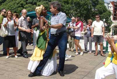 El miércoles 3 de marzo llegó a Buenos Aires una docena de fragatas, bergantines y goletas, cuya mayoría son buques escuela. Estas naves participan de la regata y encuentro internacional de grandes veleros, organizado por las armadas de Argentina y Chile, denominada Bicentenario Velas Sudamérica 2010. El sábado 6 de marzo a las diez de la mañana comenzó un desfile de las tripulaciones que con sus inmaculados uniformes blancos engalanaron la Avenida Santa Fe desde Carlos Pellegrini hasta la Plaza San Martín. Los marinos iban acompañados por delegaciones de las colectividades, vestidas con sus atuendos típicos y bailando al son de la música típica de cada país. Gran cantidad de gente saludaba a su paso a cada delegación y fue muy emotivo ver las palabras de aliento que recibieron los representantes de Chile, con motivo del reciente terremoto sufrido por el país trasandino. En la plaza San Martín estaba el palco con las autoridades, que participaron del acto coordinado por la Dirección General de Relaciones Institucionales de la Secretaría General del Gobierno porteño, que también formó parte de la celebración del Bicentenario de la Revolución de Mayo. El jefe del Estado Mayor de la Armada, almirante Jorge Godoy, y el secretario de Cultura porteño, Hernán Lombardi, encabezaron el acto, donde la banda sinfónica de la Armada interpretó canciones populares y típicas de cada uno de los países que participan de la regata y luego depositaron una ofrenda floral para recordar al General José de San Martín. Hablamos con Hernán Lombardi, quien destacó las actividades de la ciudad por el Bicentenario "como la reapertura del Teatro Colón, las visitas a los grandes veleros y las representaciones típicas de cada país, que convierte a Buenos Aires en una ciudad de cultura". El acto finalizó con la banda militar tocando algunos "cuartetazos" y varias parejas bailando cerca del escenario, mientras que reservaron para el cierre un tango, que como buen almagrense no pude dejar de bailar, en esta ocasión con una integrante de la delegación de Brasil.