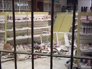 Esquinas peligrosasEl domingo 24 de abril, a las 6 de la mañana, según nos cuenta Susana "estaba durmiendo y me despertó un ruido tremendo, se sintió como un choque y ruido a vidrios rotos", esto ocurrió a media cuadra de su departamento, para ser precisos en la esquina de Salguero y Perón, esta vez fue una farmacia y perfumería, allí un automóvil, luego de colisionar con otro, destruyó la reja del frente del local e ingresó al mismo, provocando daños en las estanterías y las mercaderías que estas contenían, frascos de perfumes, desodorantes, etc.
